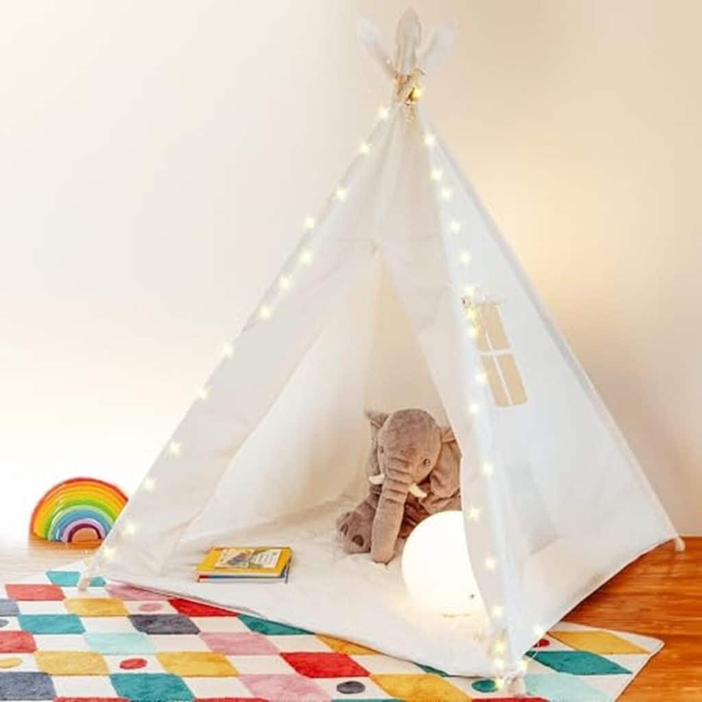 Tente pour Enfants Pliable Interieur Tipi Enfant avec Tapis et Fenêtre, Starlight,pour Salon,Chambre d'enfant, Chambre à Coucher, Camping (Blanc)Durée de vie de plusieurs années : Il est principalement composé de coton et de lin de haute qualité, résistant aux déchirures et aux rayures, avec une durabilité et une fiabilité élevées, garantissant une utilisation à long terme. Apparence élégante : La couleur unie et le design effilé de la maison ne sont pas seulement attrayants, ils s'intègrent aussi facilement dans le décor de n'importe quelle pièce. Intérieur spacieux : Elle offre un espace intérieur spacieux et confortable pour les enfants (47.2*47.2*55.1 in), peut facilement accueillir 1 à 3 enfants, et convient aux filles et garçons de 1 à 12 ans afin que les enfants puissent lire, jouer, faire la sieste, et plus encore dans la tente. Structure stable : Les poteaux en bois épais et la structure solide augmentent la stabilité du produit, réduisent les risques de glissement ou d'effondrement et améliorent la sécurité d'utilisation. Large application : Ce produit peut être placé dans un coin de la chambre d'un enfant comme coin de lecture, salle de jeux ou espace de sieste. Il peut également servir de décoration lors d'une fête d'anniversaire.