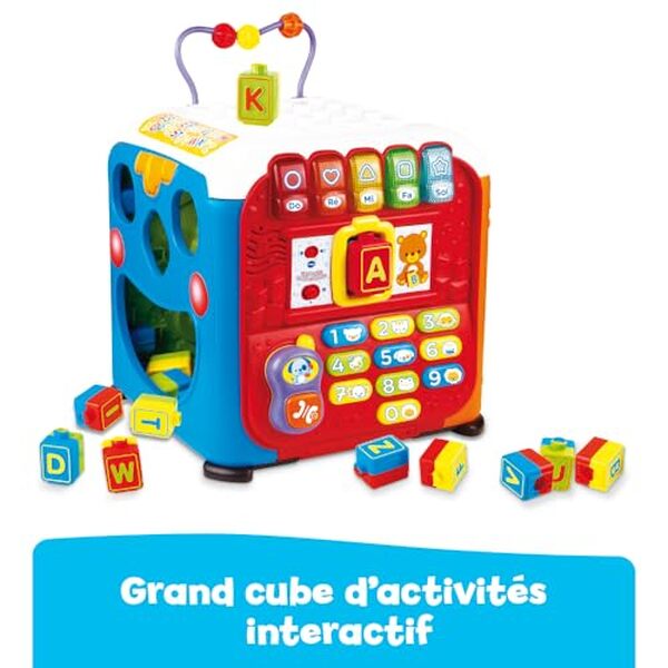 VERSION : Française. ÂGE : De 9 à 36 mois, un maxi cube de motricité avec 5 panneaux d'activités ! 5 ZONES D’ACTIVITÉS : Un tableau d’éveil 100% interactif, un tableau d'éveil non électronique, un classeur de formes, une face avec un parcours et des obstacles différents pour faire dégringoler les cubes et une table d'encastrement. INTERACTIF : Les 26 lettres de l’alphabet sont reconnues lorsque bébé encastre les 13 cubes recto/verso sur le tableau interactif. Il entend alors la lettre prononcée, le nom d’un objet ou d’un animal associé et un son correspondant. 2 MODES DE JEU : Découvertes et musique. INCLUS : 10 mélodies et 2 chansons sont incluses dans ce jouet éducatif. Volume réglable et arrêt automatique. Fonctionne avec 3 piles LR6 AA incluses.